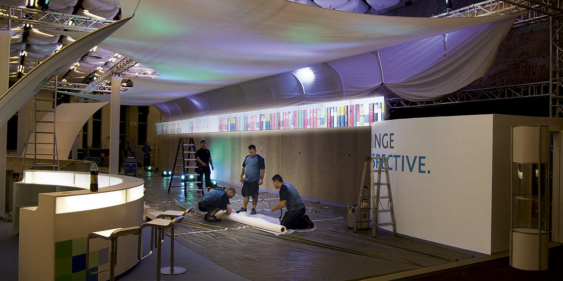 Planung, Organisation, Besichtigung der Location, Erstellen von Zeichnungen, 3D-Darstellungen, Materialermittlung, Personalplanung.... und dann der Aufbau.