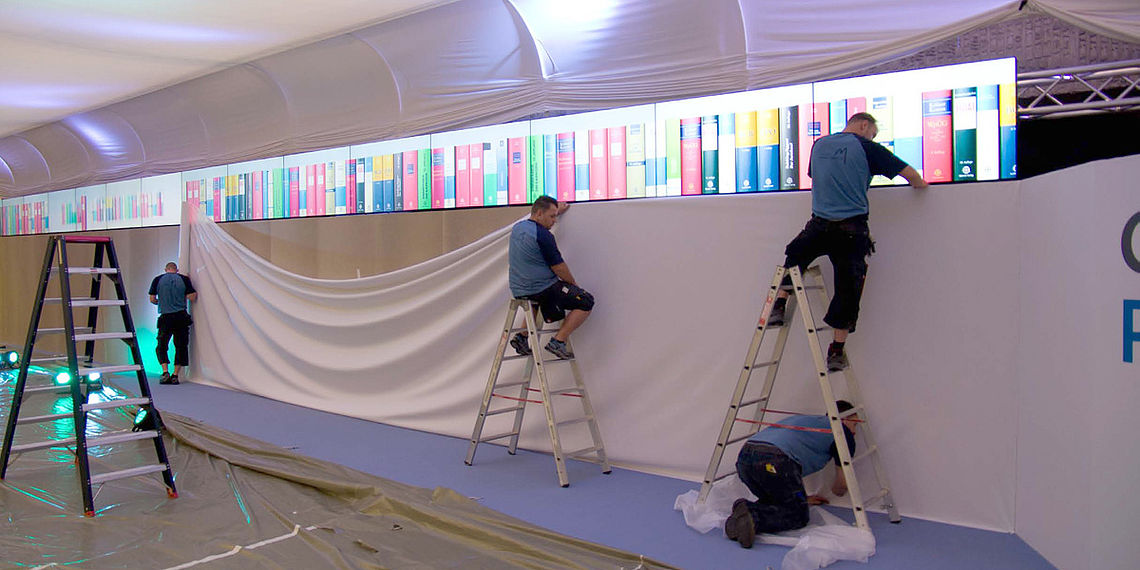 Team Blau verlegt einen Doppelboden mit Teppich, baut eine Rückwand mit Kabine und stellt Raumteiler und macht Stoffbespannungen.